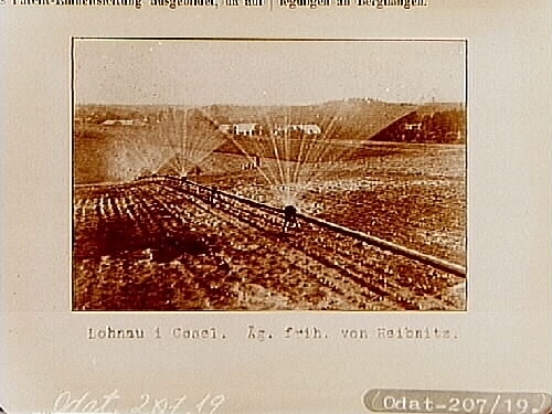 Titel: Konstbevattning. Bilden tagen ur tysk bok. Jordbrukskonsulent H. Flodkvist, Hushållningssällskapet, Stortorget 18, Örebro.