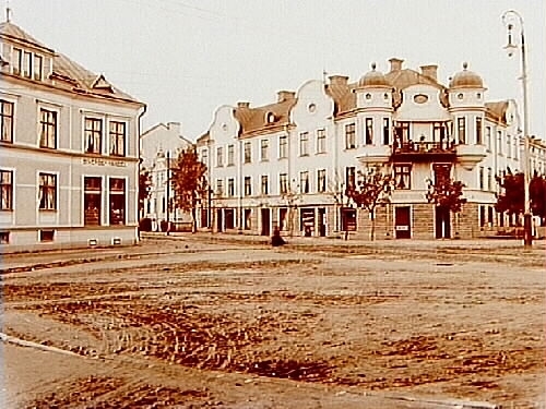 Trähus i tre våningar med jugendpräglad fasad i gulvit slätputs, frontespisar och två burspråk med taktorn.