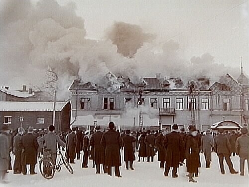 Titel: Tvåvånings bostadshus som brinner, brandkåren är där och släcker.