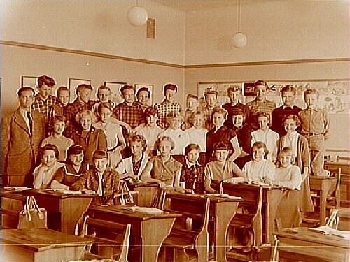 Engelbrektsskolan, klassrumsinteriör, 32 skolbarn med lärare Karl Larsson, klass 6Hh, sal 17.