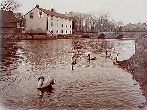 Byggnader, Arbetshuset, Kanslibron och Karolinska skolan. Fem svanar i Svartån.