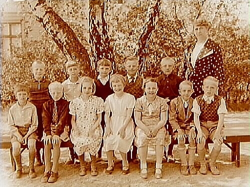 Rynninge skolan, 12 skolbarn med lärarinna fru Gerda Nystedt.