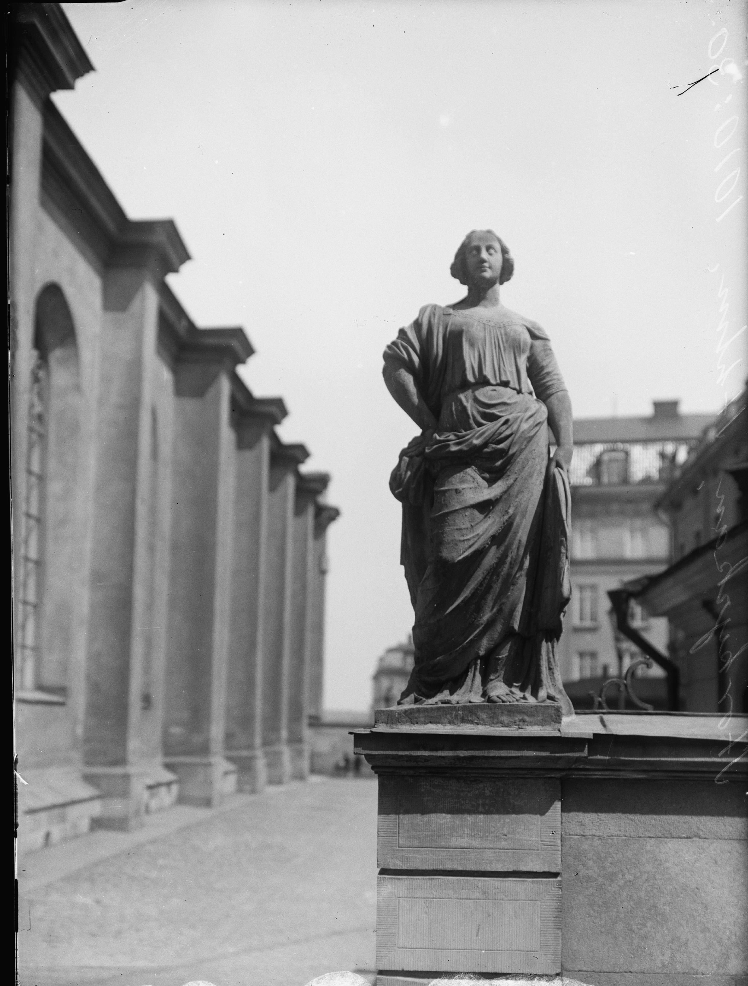Västra kyrkogårdsingången, allegorisk skulptur föreställande Förnuftet, av P. Schultz 1675.