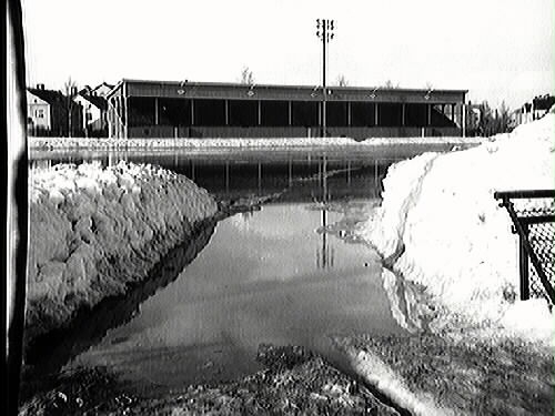Eyravallen. Fotbollsplanen är full med snö och is.