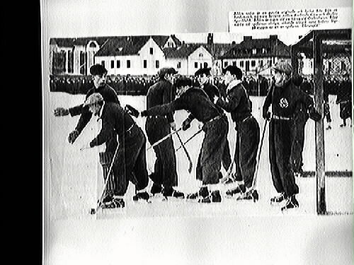 Bandy gammal bild (år 1935) fr.v. målvakt H Gellert, 'Sme-Kalle' Karlsson, Kalle Olsson, Elle Östling, Börje Johansson, Rune Lindström och Torsten Eriksson.