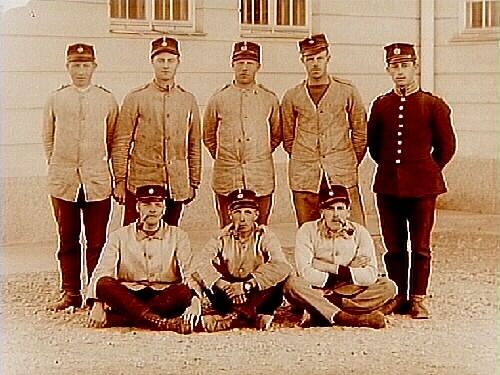 Åtta soldater utanför kasern.