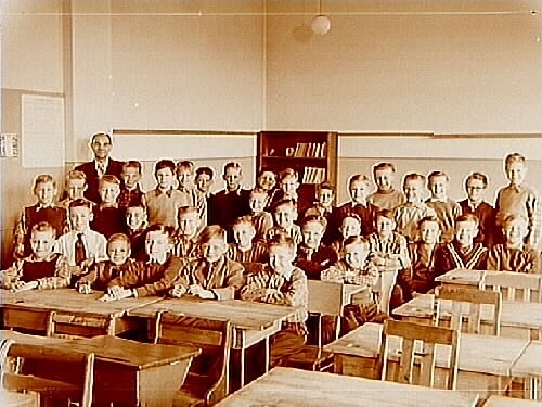 Olaus Petriskolan, klassrumsinteriör, 36 pojkar med lärare Einar Hult, klass 4A, sal 21.