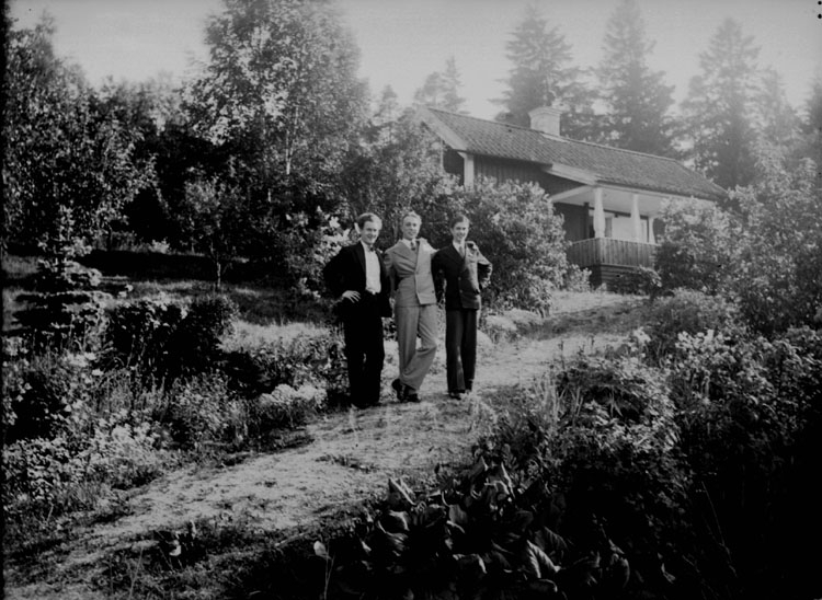 Sommarstugan Fridensborg, tre unga män framför stugan.