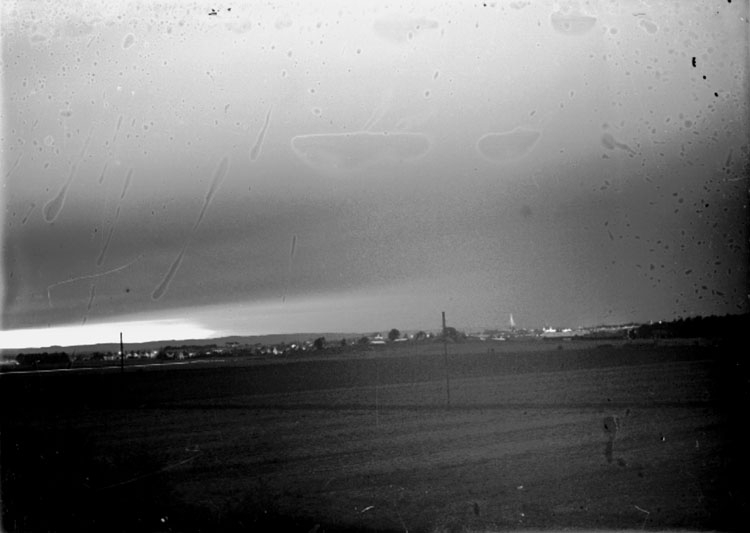 Bostadshus och byggnader i bakgrunden, åkermark i förgrunden.