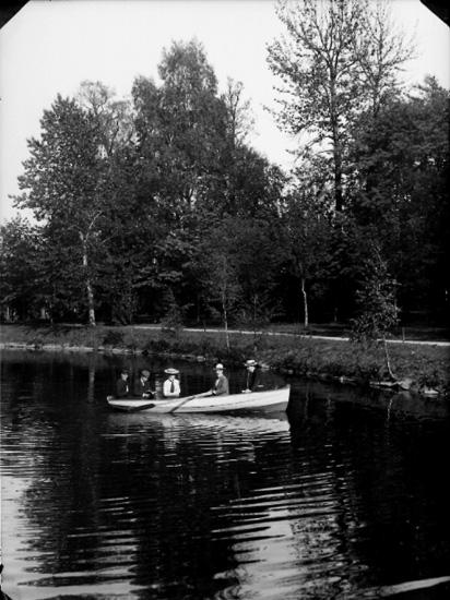 Fem personer i en roddbåt på Svartån.