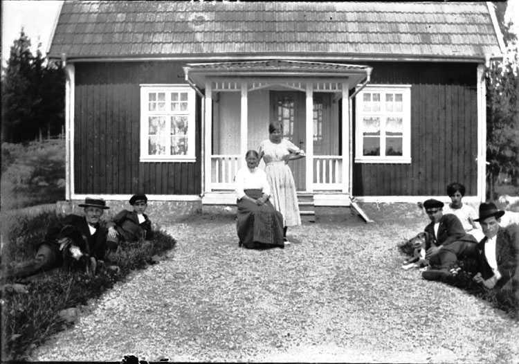 Envånings bostadshus, sju personer och två hundar framför huset.