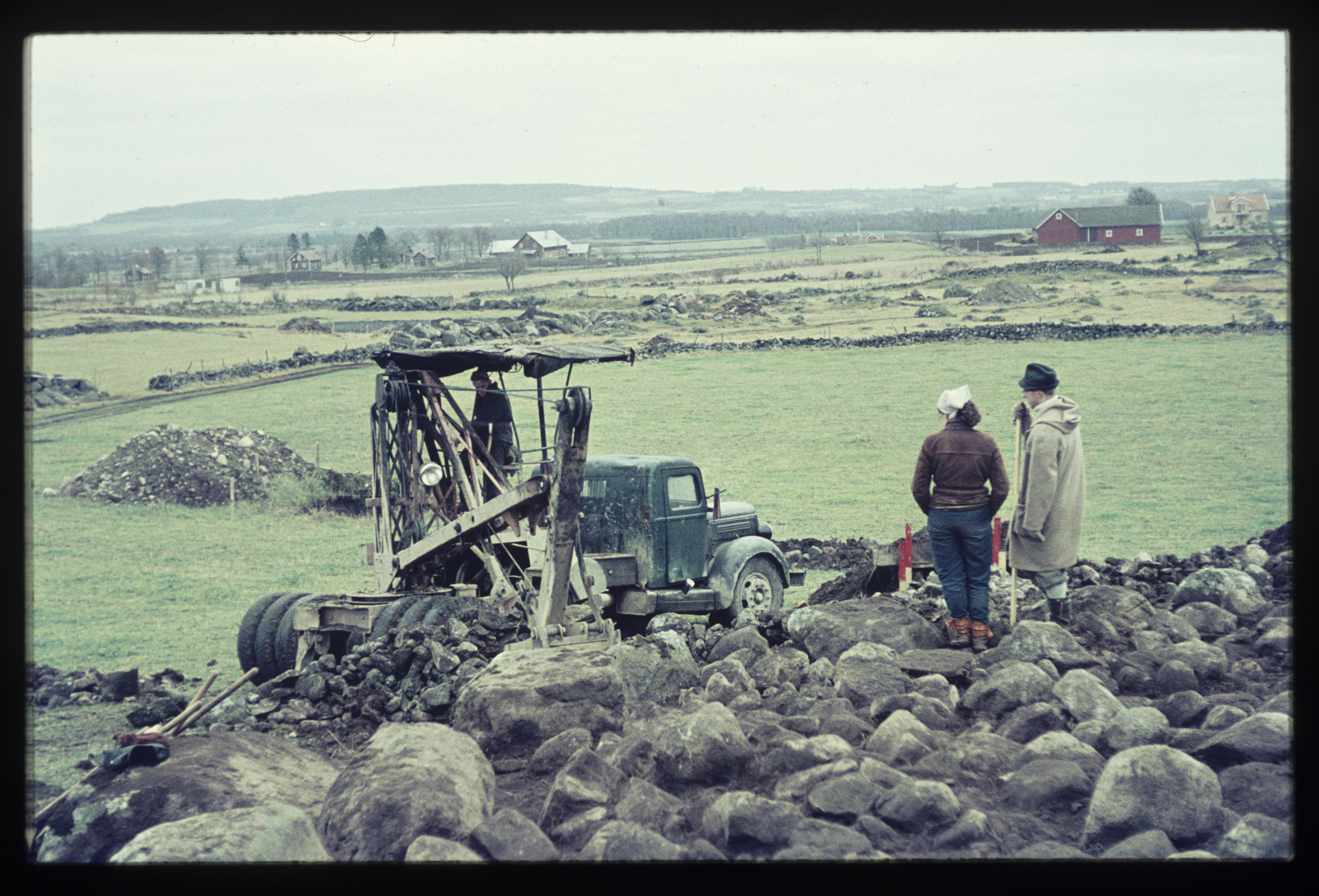 Grav 12. Arbetsbild. En lastbil med en grävskopa används i arbetet. Från arkeologisk utgrävning 1958-1960 inför anläggandet av Ranstadsverken.