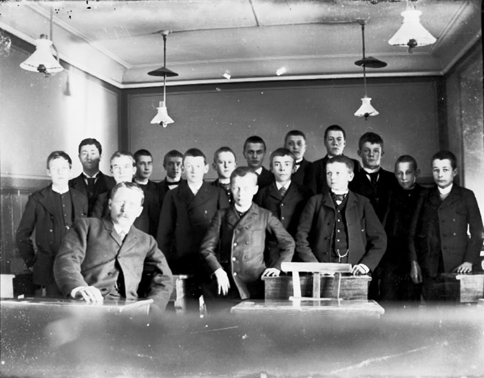 Klassrumsinteriör, 16 skolpojkar med lärare.