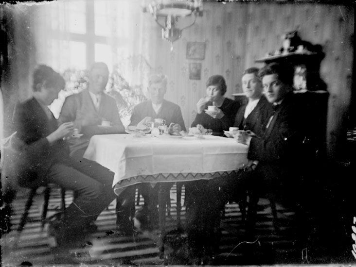 Rumsinteriör, kaffedrickande, sex personer vid bordet.
