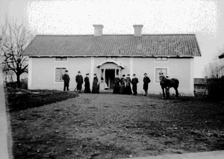 Envånings bostadshus, 11 personer och en häst framför huset.