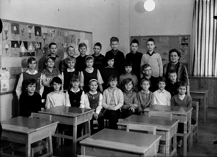 Klassrumsinteriör, 23 skolbarn med lärarinna.