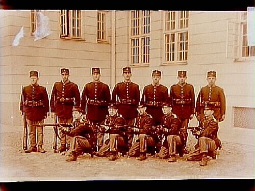 12 soldater utanför kasern.