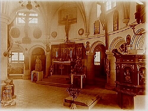 Örebro Läns Museum, kyrksalen, predikstol, altartavla, helgonfigurer, Kristus på korset.