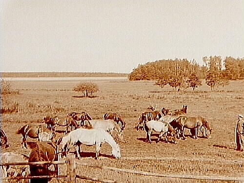 Betande hästar på ängen.