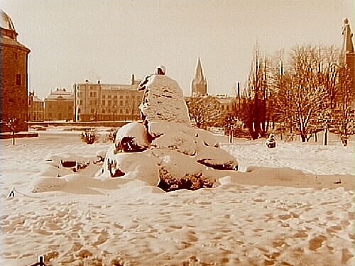 Centralparken, statyerna Befriaren och Karl den XIV Johan, snöklädda.