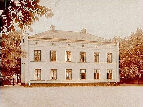 Gumaeliusskolan, skolbyggnad, stenhus i två våningar med fasad i grå stänkputs.