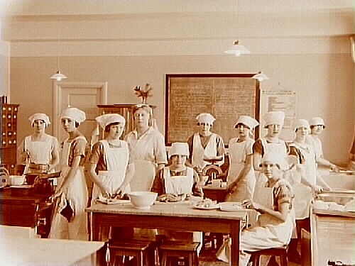 Almby skolan, interiör av skolköket, 10 flickor med lärare.