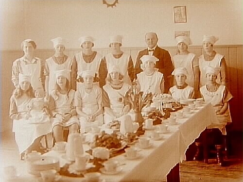 Trädgårdsskolan, skolköket, 12 skolflickor med lärare.