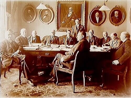 Rumsinteriör med Hypoteksföreningens styrelse, elva herrar.