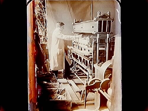Skofabriken Örnen, interiör, en man vid skomaskinen.