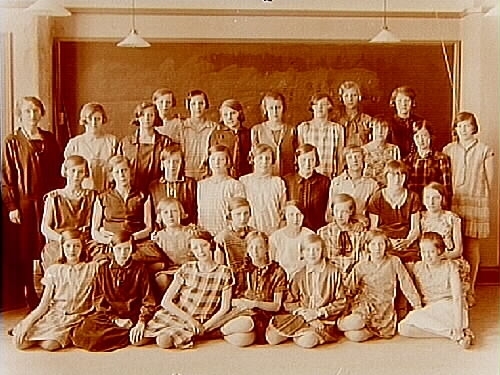 Engelbrektsskolan, klassrumsinteriör, 32 skolflickor med lärarinna fru Astrid Sund, sal 24.