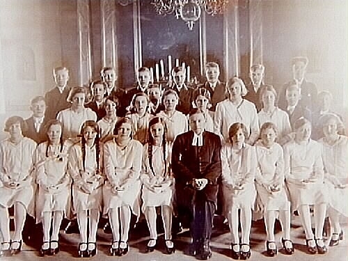 Konfirmander, 16 flickor, 12 pojkar och pastor H. Hedström.