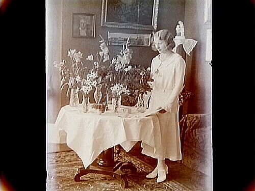 Rumsinteriör, en kvinna vid blomsterbordet.