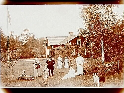 En och en halvplans bostadshus, vinkelbyggt, med veranda. Grupp 8 personer och en hund framför huset.