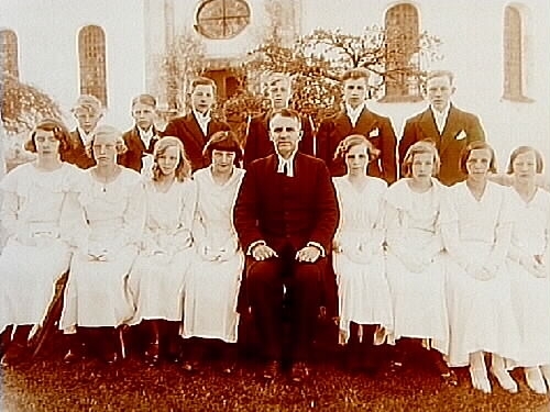 Konfirmander, 8 flickor, 6 pojkar och kyrkoherde Areborg.