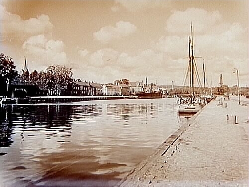 Motiv från hamnen med lastfartyg och skutor.