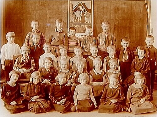 Engelbrektsskolan, klassrumsinteriör, 27 skolbarn med lärarinna fröken Emmy Söderlund, sal 14.