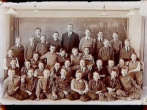 Engelbrektsskolan, klassrumsinteriör, 34 skolpojkar med lärare S. Vinström, klass 6G, sal 19.