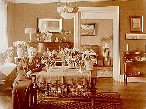 Titel: Rumsinteriör, en kvinna. Fru Alma Karlssons födelsedag.