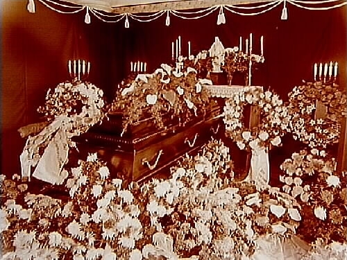 Begravning, likkista med kransar och blommor.