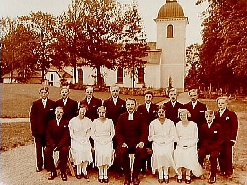 Konfirmander, 4 flickor, 10 pojkar och kyrkoherde Areborg.