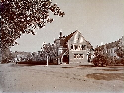 Betlehemskyrkan, frikyrkobyggnad med fasad i rött tegel med vita blinderingar.