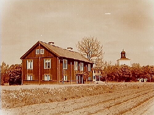 Västerhaninge Gamla Tingshus med kyrkan i bakgrunden.
