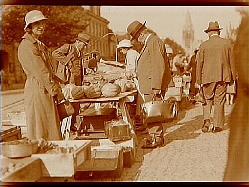 Titel: Torghandel på Stortorget, torgstånd med handlare och kunder.