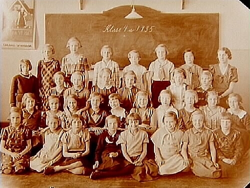 Olaus Petriskolan, klassrumsinteriör, 31 flickor med lärarinna fröken Monö, klass 4a, sal 12.