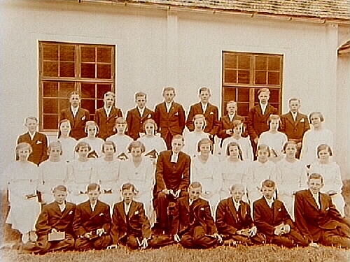 Konfirmander, 18 flickor, 16 pojkar och pastor Eriksson.