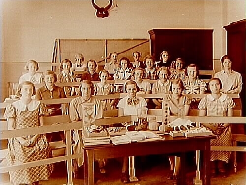 Kommunala Flickskolan, klassrumsinteriör, 20 flickor med lärarinna fröken Gillner.