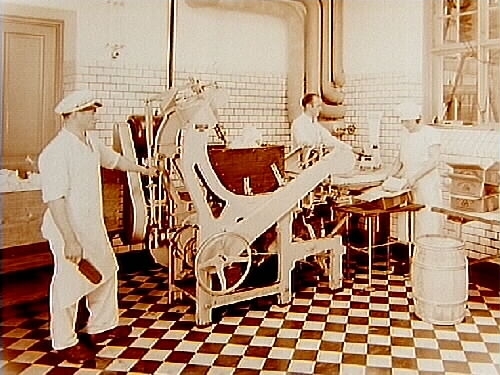 Mejeriinteriör, smörpaketering, två män och en kvinna.