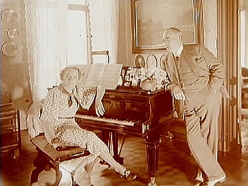 Rumsinteriör, makarna Danielsson vid flygeln.