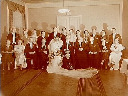 Bröllop, brudpar och bröllopsgäster inomhus.