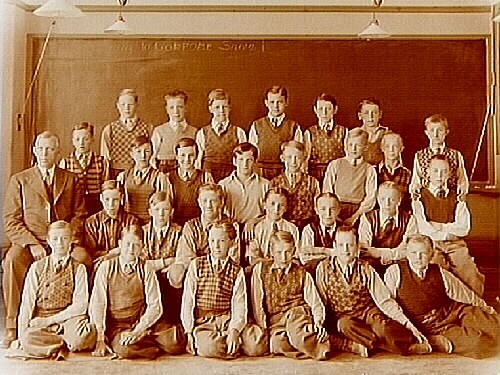 Engelbrektsskolan, klassrumsinteriör, 27 skolpojkar med lärare S. Winström, sal 20.